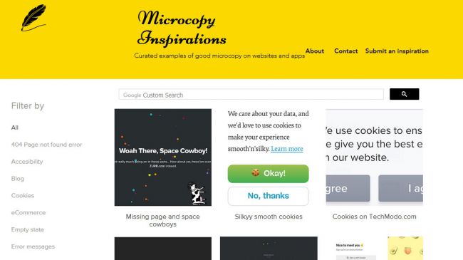 داشتن یک مجموعه بزرگ از المانهای طراحی و صفحات مشابه به همدیگر میتواند بسیار کمک کننده باشد. Microcopy Inspirations یک مجموعه بزرگ از صفحات و المانهای طراحی مختلف است که میشود آنها را تقریبا در هر وبسایتی مشاهد کرد.