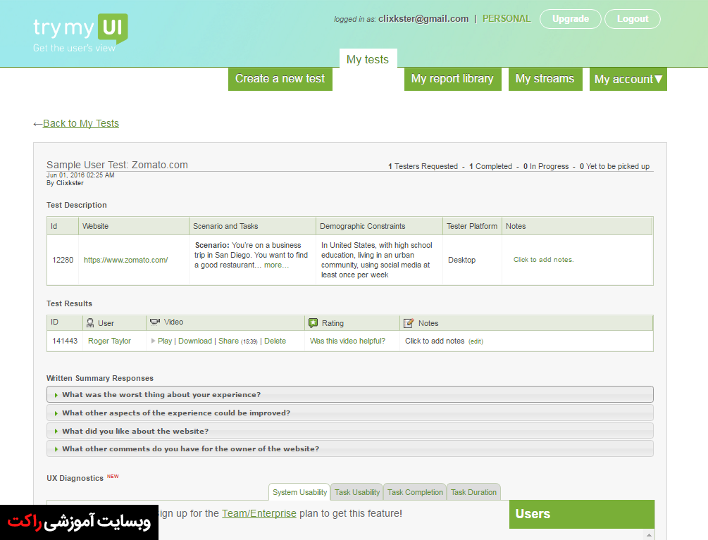 بهترین راه برای ثبت فعل و انفعالات کاربر با وبسایت ، به همراه پاسخهای دریافتی آنها، استفاده از ویدئو بوسیله UserTesting است. شما میتوانید مخاطب هدف خود را انتخاب کنید و برای کاربران یک وظیفه، برای کار با وبسایت یا نرم افزار خود مشخص کنید.