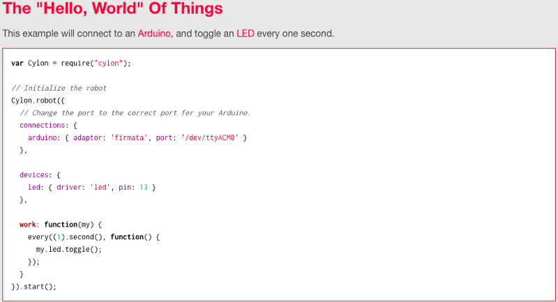 Cylon یک فریموورک JavaScript با پشتیبانی بیش از 43 پلتفرم برای رباتیک، محاسبات فیزیکی و اینترنت اشیاء است. آیا میخواهید یک ربات یا یک پهباد بسازید؟ پس احتمالا Cylon جایی است که میخواهید بروید. Cylon میتواند مستقیما در مرورگر (از طریق browserify) یا هر برنامه متصل به Chrome اجرا شود، و از http / https، mqtt و پلاگینهای socket.io پشتیبانی میکند. نگاهی به آن داشته باشید.