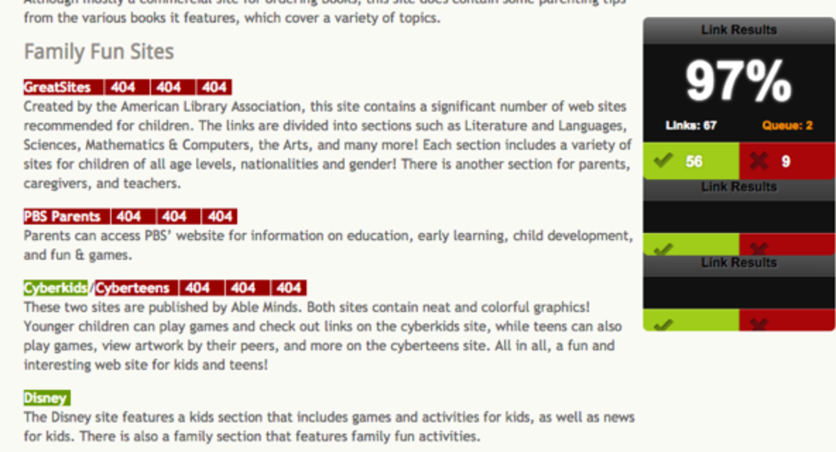 برای مثال اگر من سایت مخصوص فرزندپروری دارم, من برای فرزندپروری + لینک ها جستجو می کنم. برای اینکه لینک های شکسته رو براحتی در اون صفحات پیدا کنید, پلاگین گوگل کروم به اسم Check my Links رو نصب کنید. با استفاده از این پلاگین, من به سرعت تمام لینک های شکسته 404 رو از این صفحه پیدا کردم :