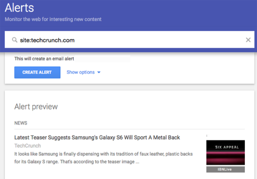 در خبرنامه ایمیلی اونها عضو بشید یا در شبکه های اجتماعی دنبالشون کنید. یک راه هوشمندانه ی دیگه اینه که یک هشدار گوگل برای محتوای جدید با کلید واژه ی “site:yourcompetitor.com." بسازید. برای نمونه اگر رقیب من TechCrunch باشه, من میتونم یک هشدار گوگل با استفاده از کلیدواژه ی site:techcrunch.com بسازم.