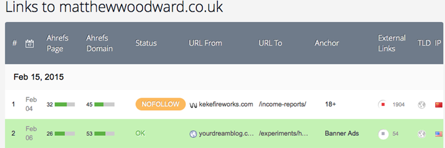ابزار محبوب من برای چک کردن بک لینک های رقیب Monitor Backlinks هست( البته اگر قصد هزینه ی اضافی ندارید ابزارهای رایگان مثل این ابزار وجود داره که کمکتون میکنه). این به شما اجازه میده تا چهار رقیب اصلی تون رو اضافه کنید. یک گزارش ماهیانه دریافت میکنید که شامل لینک های جدیدی است که اونها بدست آوردند. داخل این ابزار میتونید اطلاعاتی در مورد لینک ها بدست آورده و براساس ارزششون مرتب کنید. نکته جالب اینه که تمام لینک هایی که سایت من داره به رنگ سبز نمایش داده میشه. مثل شکل زیر :