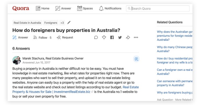 آیا تا به حال سوالی را در گوگل تایپ کردهاید و جواب شما در Quora یا Stack Exchange نشان داده شده است؟ وبسایتهای پرسش و پاسخ مثل ماشینهای ترافیکی هستند. در واقع Quora در بین ۲۰۰ وبسایت محبوب جهان قرار دارد. مباحث و سوالات کلیدی در صنعت خود را شناسایی کنید، سپس سعی کنید به صورت مختصر به آنها پاسخ دهید. فراموش نکنید که در صورت لزوم، لینکی را به وبسایت خود پیوند بزنید.