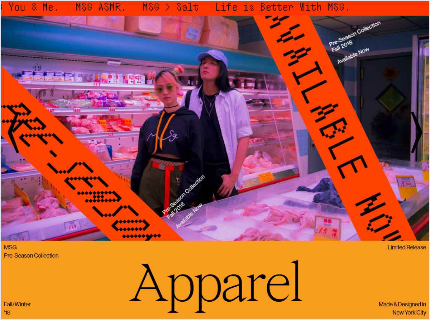 سبک بروتالیسم با فونتهای سخت، عناوین بزرگ و ترکیبی از رنگهای روشن و نئونی، تمام قوانین را زیر پا میگذارد. در تصویر پایین میتوانید برند MSG را ببینید که از این سبک استفاده کرده است.