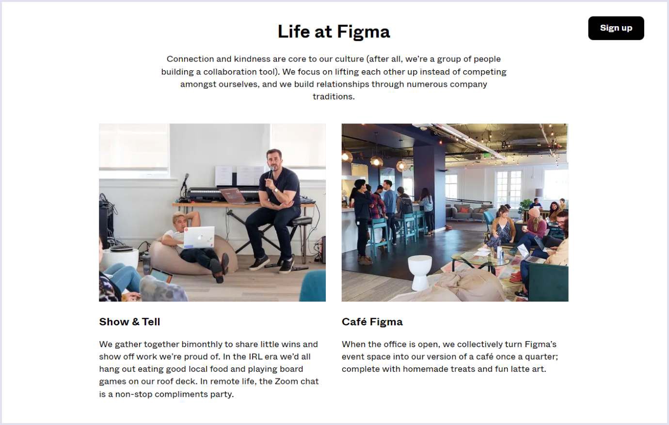 عکسهای واقعی و زنده در سال 2022 یکی از روشهای کلیدی برای جذب مخاطبان به وبسایت است. امروزه مشتریان به تیمهای طراحی و فضای کاری آنها اهمیت میدهند و میخواهند با این مسائل آشنا شوند. Figma از تصاویر زنده در طراحی وبسایت خود استفاده کرده که پایین میتوانید این موضوع را به خوبی مشاهده کنید.