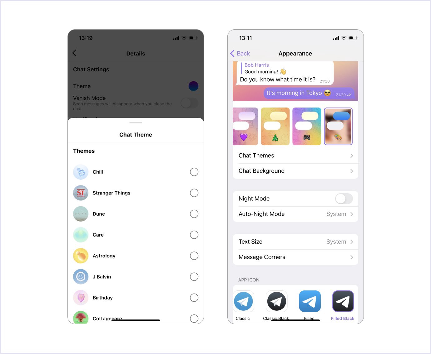 کاربران به کمک سفارشیسازی میتوانند برخی از کامپوننتهای طراحی را خودشان انتخاب کنند. تنظیمات کاربری در تلگرام یک نمونهی بسیار خوب در این خصوص است. کاربران در این برنامه میتوانند رنگ، مقیاس، والپیپر، زبان و موارد دیگر را تغییر دهند.