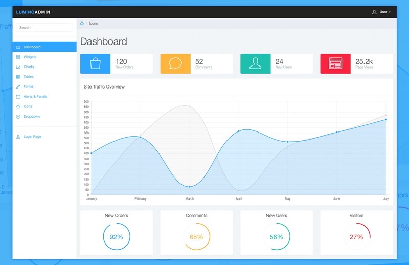 طراحی سادهی این قالب یک مزیت به شمار میآید. این قالب تمام آنچه را که نیاز دارید به شما نشان خواهد داد. با Bootstrap ساخته شده و دارای المانهای مختلف UI مثل دکمهها، آیکونها و موارد دیگر است. این داشبورد شامل نمودارها و تمام اطلاعات مهم برای تجزیه و تحلیل صفحهی وب شماست. همچنین شامل ۷ صفحهی آماده برای استفاده است تا فوراً بتوانید کار بر روی محصول خود را شروع کنید.