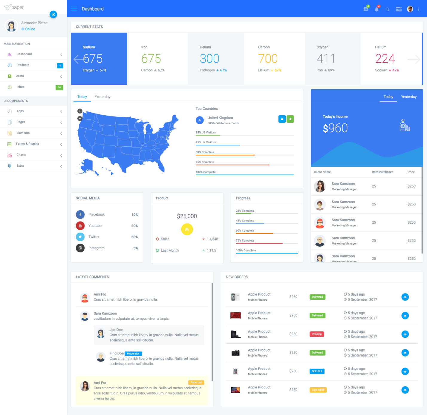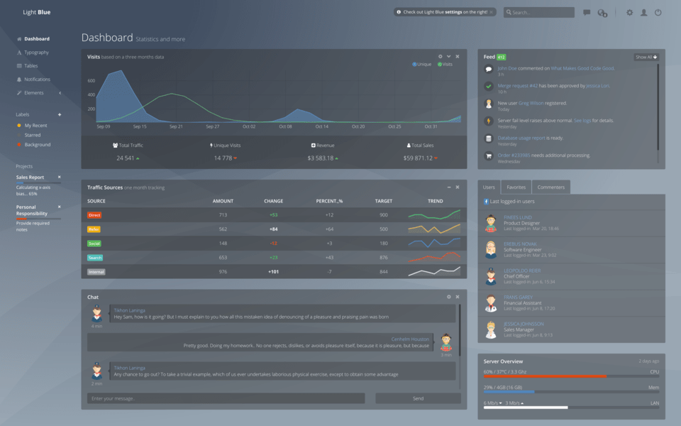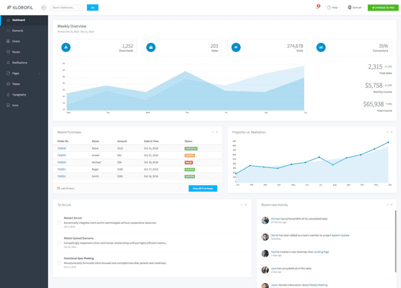 اگر به دنبال یک قالب رایگان با طراحی زیبا و مدرن هستید، این مورد یک انتخاب عالی به نظر میرسد. این قالب ۵۰ مولفه دارد و شامل نمودارهای زیبا، جداول مختلف، جداول زمانی، اعلانها، لیستی از وظایف و تمام چیزهایی است که شما برای محصول خود به آن نیاز دارید. این قالب دارای صفحاتی است که برای استفاده کردن آماده هستند؛ مثلاً صفحه پروفایل، صفحهی ورود یا صفحه قفل. به همین خاطر است که استفاده از این قالب برای کاربران جدید هم آسان خواهد بود.
