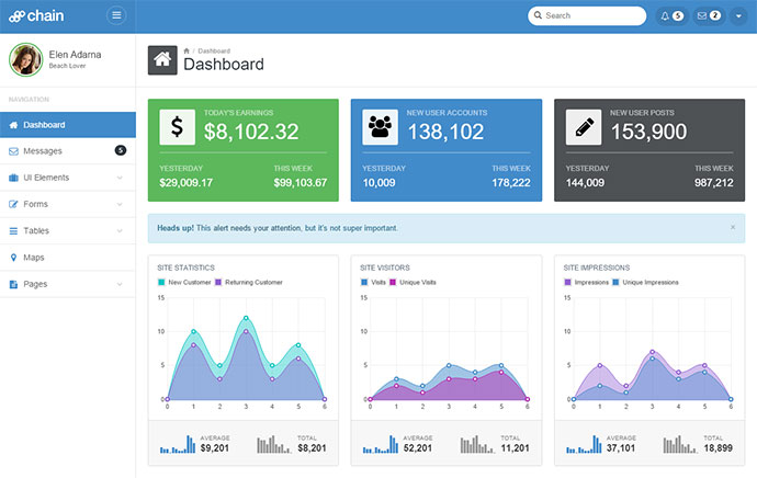 این قالب با استفاده از Bootstrap HTML5 ساخته شده است. این مورد بهترین پنل ادمین backend میباشد زیرا دارای ویجتها، نمودارها و مولفههای UI مختلفی است. شما میتوانید رنگ آن را با SAAS تغیر دهید. این قالب دارای یک فهرست بوده و عملکردهایی درونی را در اختیار کاربران قرار میدهد. مانند مورد قبلی که گفته شد، این قالب نیز میتواند به نسخه حرفهای ارتقا داده شود.