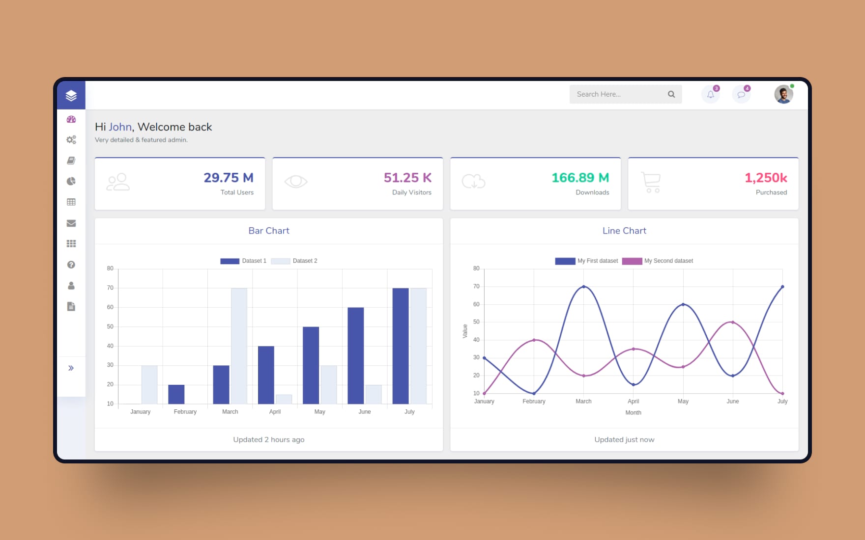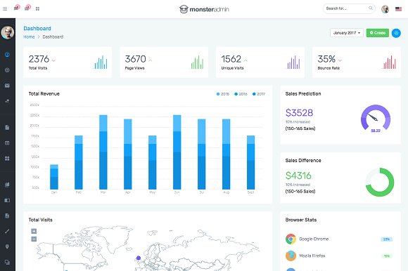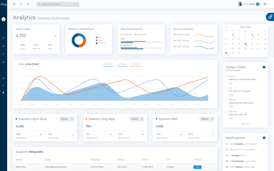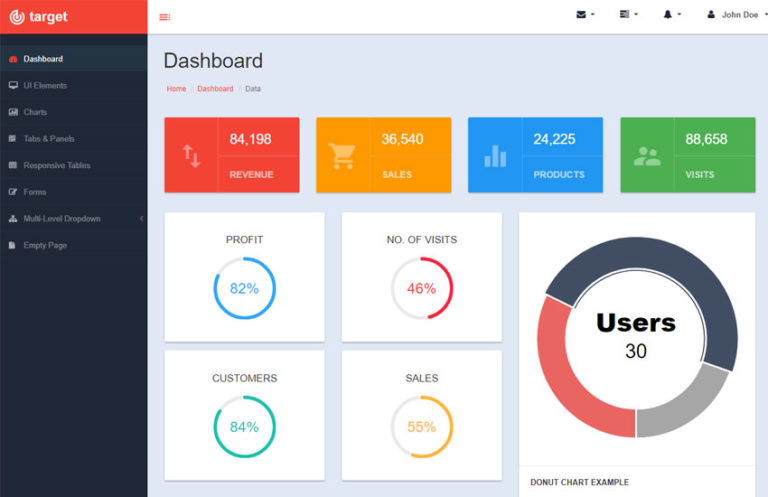 این مورد یک گزینه عالی برای هر برنامه یا وبسایتی است. همچنین شامل قابلیتهایی برای نظارت بر آمار کاربران فعال یا بازدیدکنندگان روزانه است. طراحی را میتوان مزیت اساسی این قالب دانست. فضای سفید استفاده شده در پس زمینه، اطلاعات را خواناتر و آنالیز کردن را آسانتر میکند. تمام اطلاعات اصلی در بالا قرار داده شده است. در سمت چپ یک نوار را مشاهده میکنید که در صورت عدم نیاز، میتوانید آن را مخفی کنید.