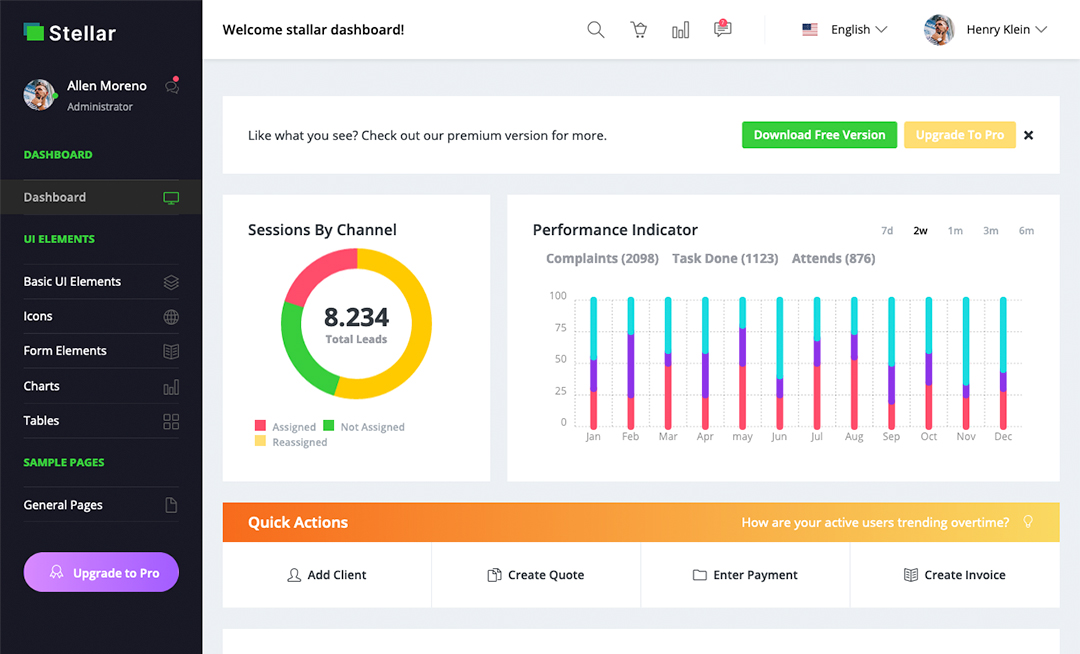 با اولین نگاه به این قالب متوجه طراحی زیبا و کدهای واضح آن خواهید شد. این قالب با کمک مولفههای UI و سفارشیسازی، تمام خواستههای شما را مد نظر قرار میدهد. Stellar Admin در برنامههای Backend پیچیده و ساده بسیار خوب عمل خواهد کرد. این قالب دائماً بروزرسانی میشود، به همین خاطر دیگر نیازی به نگرانی نیست. این قالب آماده است تا تجربههای فوقالعادهای را برای شما در دسکتاپ و گوشی رقم بزند.
