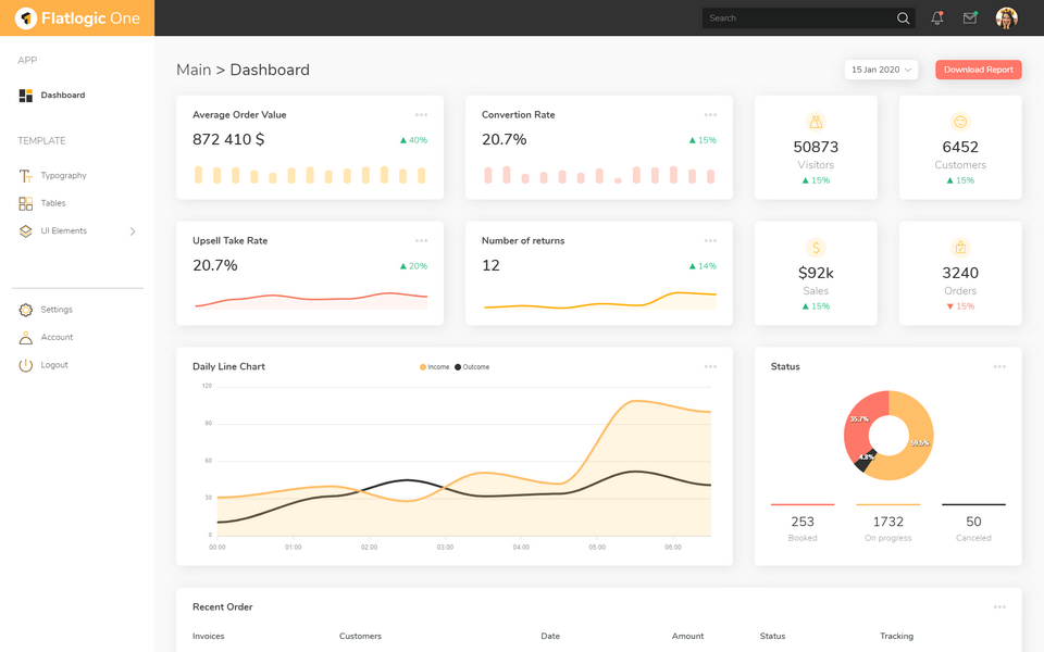 این قالب یک مورد کاملاً جدید در بین قالبهای ساخته شده با تکنولوژی Bootstrap است. اگر میخواهید برنامههایی را بسازید که دارای جداول داده و آنالیز باشند، این قالب یک انتخاب خوب خواهد بود. طراحی این قالب در ۳ رنگ مختلف در دسترس است. این رنگها شامل خاکستری، سفید و نارنجی هستند، بنابراین میتوانید بهترین گزینه را برای محصول خود انتخاب کنید. تمام المانهای Bootstrap را میتوان به آسانی شخصیسازی کرد، به همین خاطر این قالب کاملاً واکنشگرا میباشد. Flatlogic One Bootstrap دارای نمودارهای زیبا و پس زمینهای عمیق است. این داشبورد کاملاً برای توسعهدهندگان مناسب میباشد. این قالب دارای مستندات جامع و پشتیبانی کامل برای حل سریع و دقیق تمام مشکلات است.