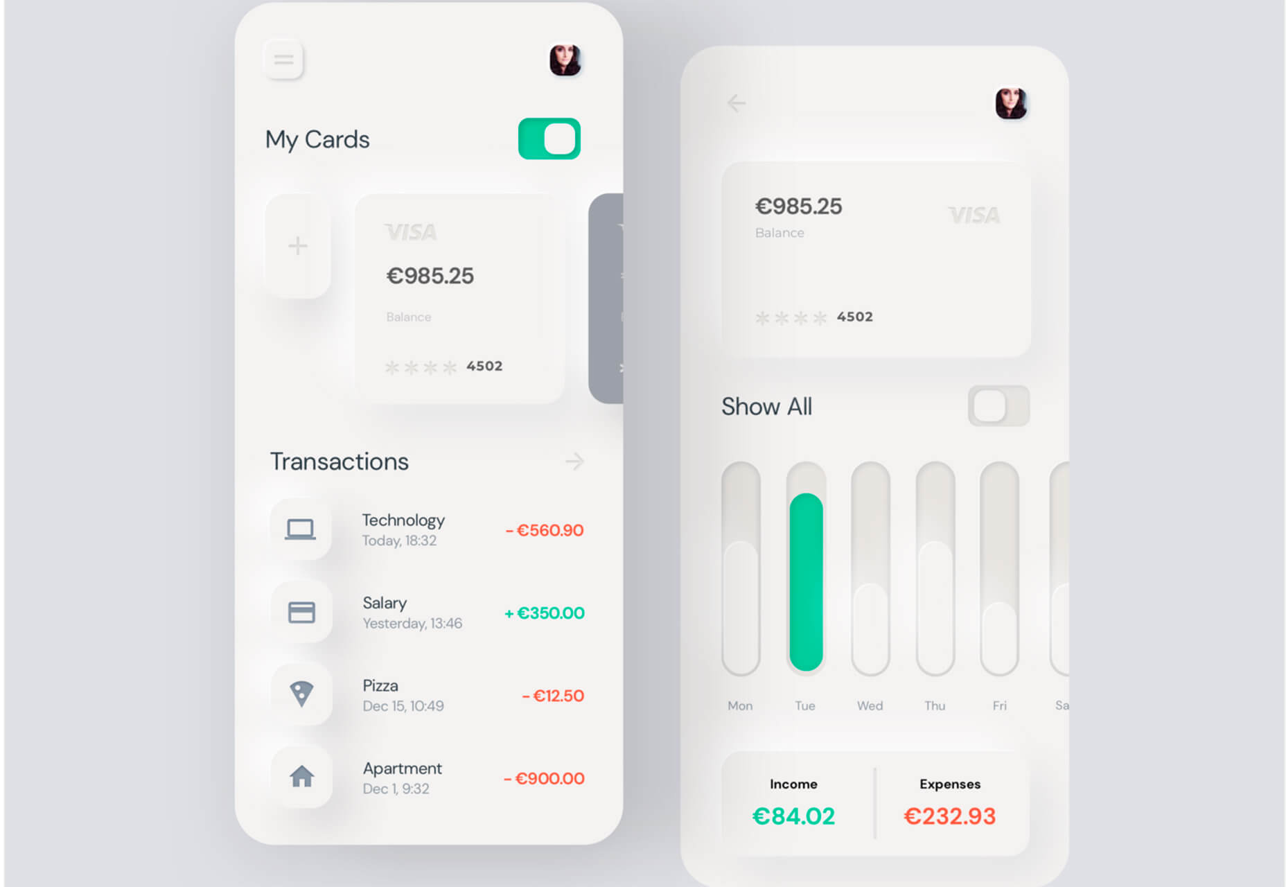 Neumorphism (يا اسكيومورفيسم skeuomorphism جديد) را ميتوان به يك تحليلگر به نام Michal Malewicz از Hype4 نسبت داد كه كاوشي عميق درمورد اينكه اين ترند چيست (و چه چيزي نيست) و چگونه براي طراحان عمل ميكند انجام داد. نيومورفيسم ظاهرا در هنگام طراحي اينترفيسهايي كه به كارت شباهت دارد (card-style)، بسيار شيوهاي محبوب است.