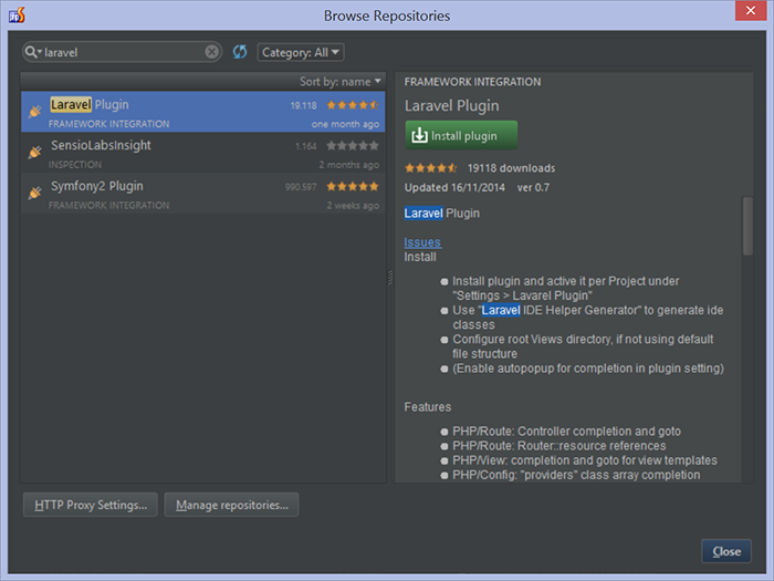 در بخش Settings (Preferences) | Plugins روی Browse repositories.. کلیک کنید و برای laravel جستجو کنید, برای نصب پلاگین روی Install plugin کلیک کنید.