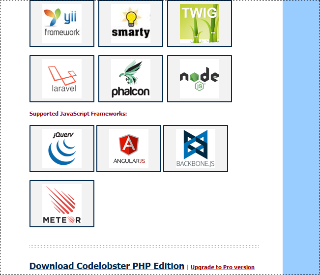 Codelobster PHP Editon فرایند توسعه ی PHP رو بسیار ساده می کنه. دیگه لازم نیست اسم توابع, argument ها, تگ ها یا خواص شون رو بخاطر بسپرید – همه ی اینها برای شما جمع آوری شدهاند همچنین ویژگی autocomplete برای PHP, HTML, JS و CSS فراهم هست. شما همیشه میتونید با استفاده از کلید F1 به اطلاعات راهنما دسترسی پیدا کنید.