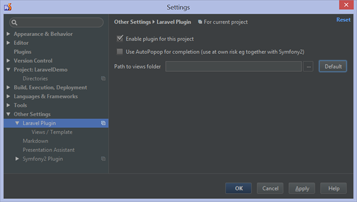Settings (Preferences) | Other Settings | Laravel Plugin | Enable Plugin for this Project