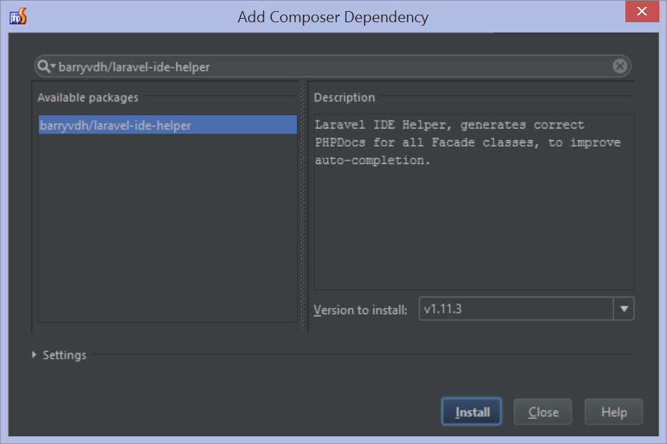 وقتی Composer برای استفاده در پروژه مون آماده شد, میتونیم Laravel IDE Helper رو در پروژه مون نصب کنیم. ما میتونیم با استفاده از منوی Composer | Add dependency و جستجو برای barryvdh/laravel-ide-helper و کلیک روی install اون رو دانلود و نصب کنیم.