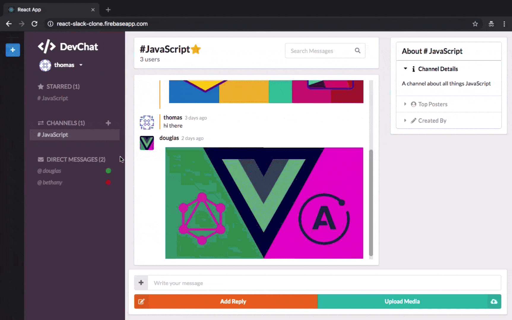 هر برنامه پیامرسانی میتواند قابلیت مکالمه با دو یا چند نفر باشد که پیامها به صورت آنلاین ارسال میشوند. مشابه برنامه وبسایتهای ارتباط جمعی، من یک سرویس مانند Firebase یا Hasura را پیشنهاد میکنم که دادهها را از طریق WebSockets برای پیامهایی که باید بلافاصله در مکالمه نمایش داده شوند را ارسال میکند.