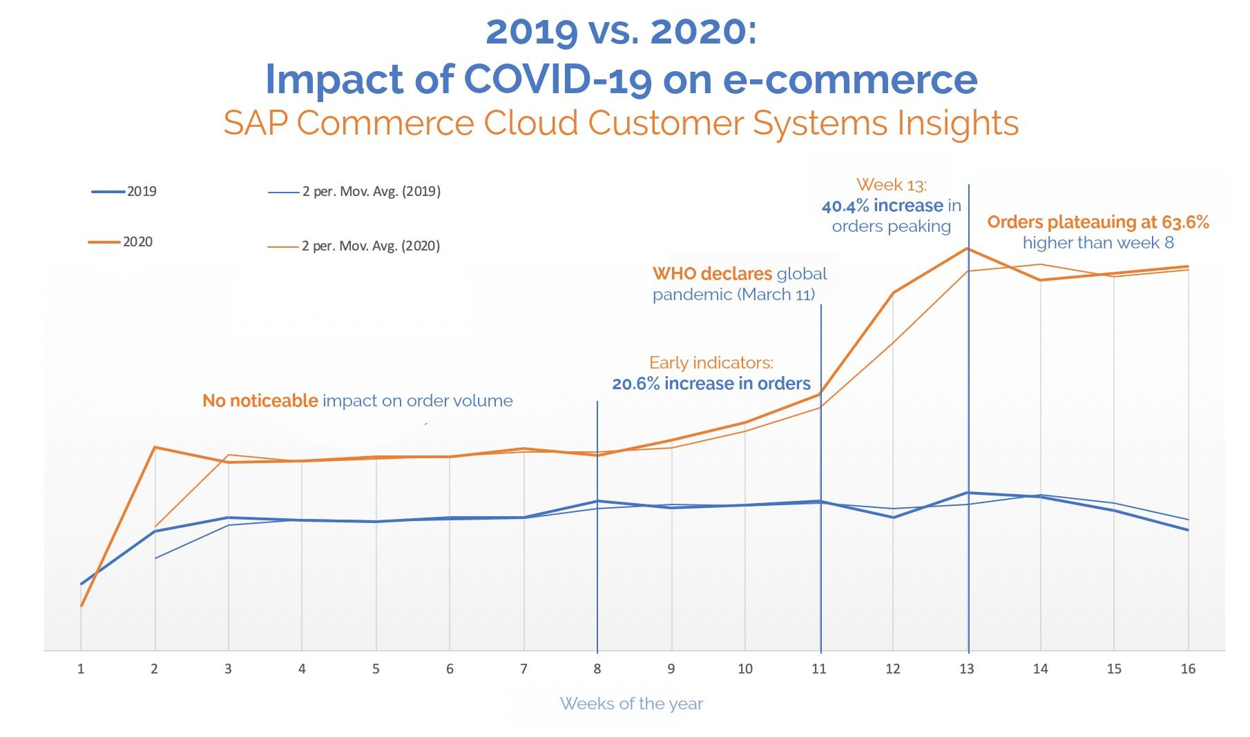 همانطور که در تصویر بالا میبینیم، سفارشات تجارت الکترونیکی در سال 2020 تا 63٪ افزایش یافته است که نشان دهنده افزایش قابل توجه سفارشات در مقایسه با سال 2019 است.