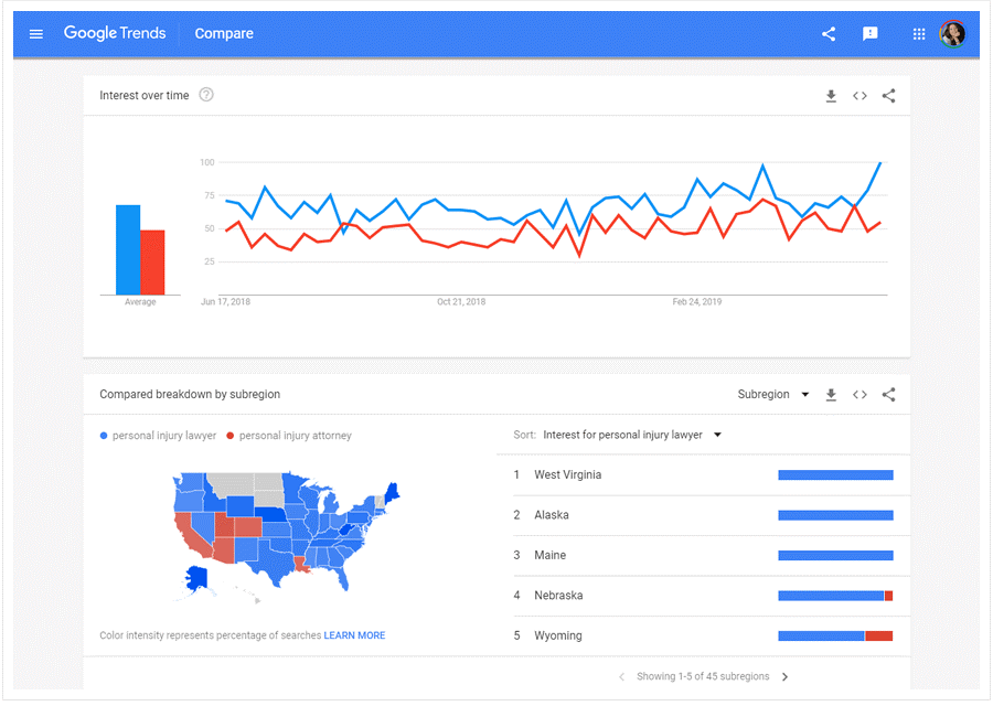 به عنوان مثال، طبق Google Trends، حتی اگر «وکیل شخصی مجرب» محبوبترین جستجو در اکثر شهرهای ایالات متحده باشد، در تنسی و نیومکزیکو، "وکیل مدافع شخصی"، بهتر بهینه شده است.