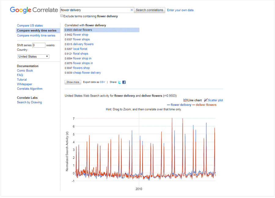 اما Google Correlate به شما کمک میکند که به لیست کلمات کلیدی خود از یک زاویه جدید و غیر منتظره نگاه کنید، این ابزار شناسایی کلماتی که نوسانات فصلی آن با کلید واژههای اصلی شما مرتبط است را انجام میدهد.