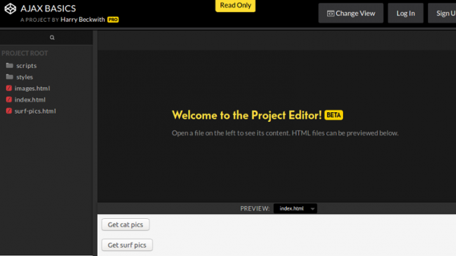 افراد پشت codepen یک (ide (integrated development enviroment ساخته اند که در مرورگر شما اجرا میشود. این شامل یک مدیر فایل سیستم هست که شما میتونید با drag & drop فایل ها رو داخلش جابجا کنید. با استفاده از این ابزار پروژه خودتون رو قبل از ساخت بصورت پیش نمایش داشته باشید.