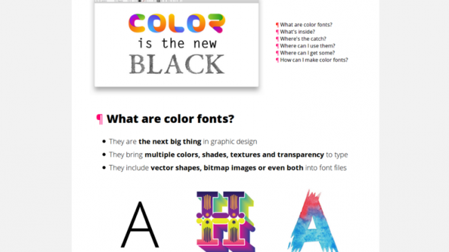 فونت های رنگ چه چیزی هستند و چگونه میتونیم ازشون استفاده کنیم؟ اینها سوالاتی هستند که جوابشان بخوبی در این سایت داده شده. اگر شما چیزی در این باره نشنیده اید, فونت های رنگ فایل های فونتی هستند که میتونند شامل رنگها, تکسچرها, vector ها و حتی تصاویر bitmap باشند.