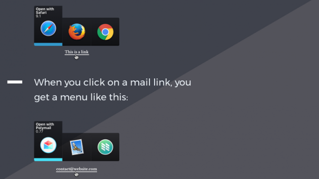 این اپلیکیشن مک یک تابع ساده دارد : وقتی شما روی یک لینک کلیک کنید, این به شما اجازه میده یک برنامه رو برای باز کردن انتخاب کنید. URL ها به شما امکان انتخاب مرورگرها و لینک های ایمیل یک پاپ آپ برای انتخاب کلاینت ایمیل به شما نمایش میدهند.