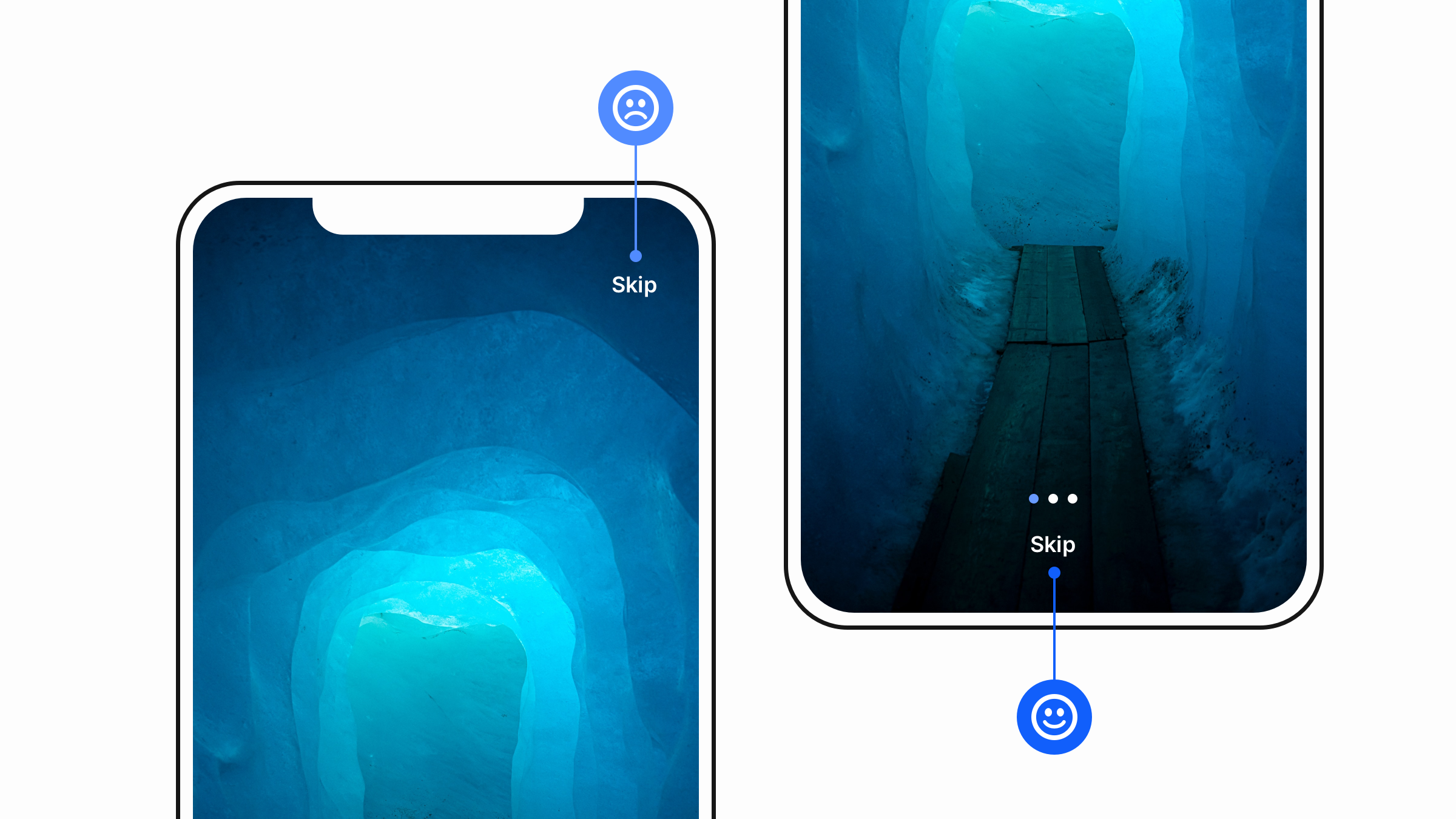 کاری کنید تا کاربران بتوانند در هر زمانی onboarding برنامه گوشیشان را پرش(skip) کنند. لینک پرش را در جایی قرار دهید که در دسترس انگشت شصت کاربر باشد. به یاد داشته باشید که انگشتان شصت هنوز هم در سال ۲۰۲۰ حکمرانی میکنند.