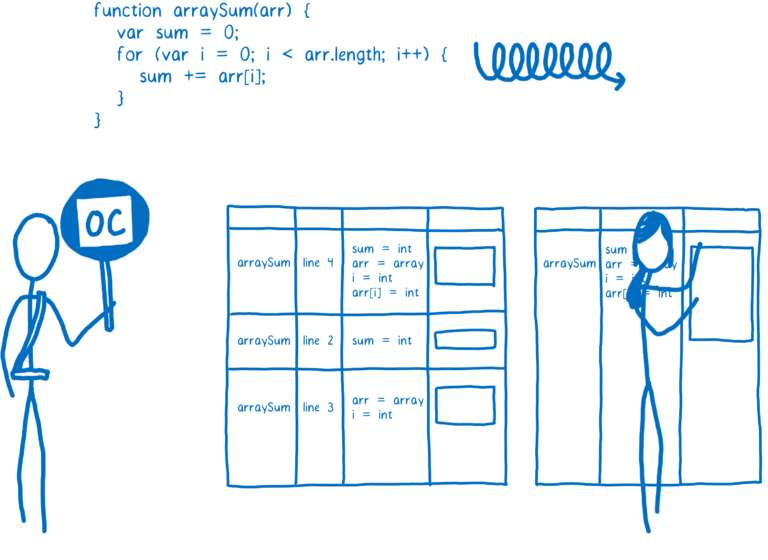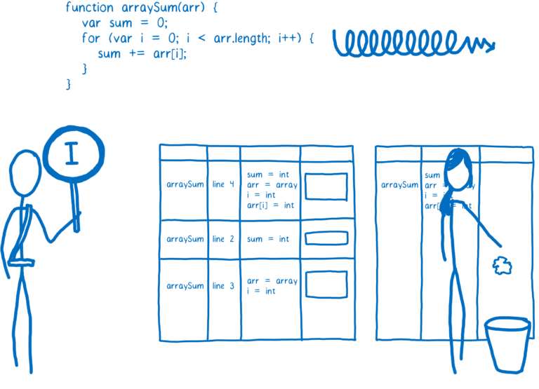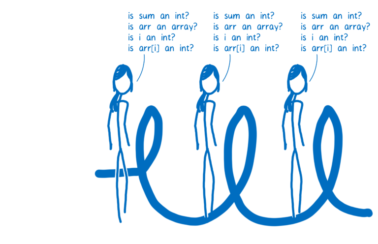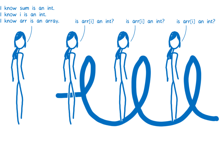 با این حال sum و arr[i] به صورت تضمینی معلوم نیست که عدد صحیح باشند. به این دلیل که نوعهای دادهای در جاوااسکریپت به صورت پویا تعریف میشوند، پس شانسی وجود دارد که در حلقه تکرارشدنی arr[i] بجای یک عدد صحیح یک رشته باشد. قرار دادن دو رشته در کنار همدیگر یا concatenation با قرار دادن دو عدد و جمع دادن آنها با همدیگر addition عملیاتهای کاملا متفاوتی هستند و کد ماشین مربوط به آنها نیز کاملا متفاوت است.