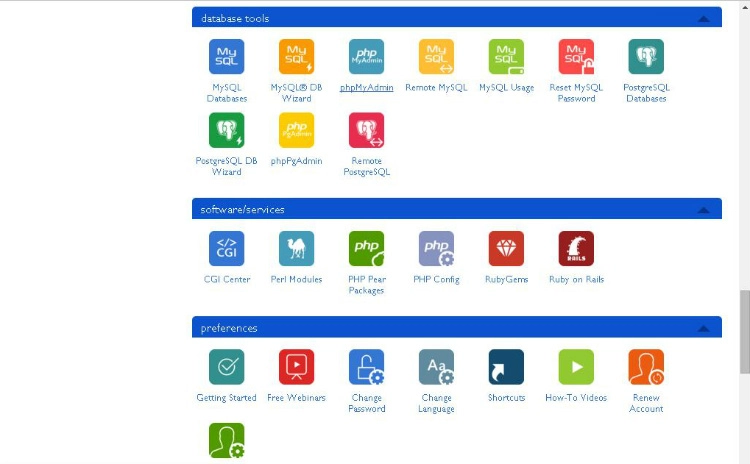 اکنون که یک کپی از فایلهای وردپرس خود دارید، بیایید از پایگاه داده وردپرس نسخه پشتیبان تهیه کنیم تا بتوانیم یک بکاپ کامل داشته باشیم. این کار نیز بسیار ساده است، فقط کافی است به پنل هاست خود رفته و phpMyAdmin را پیدا کنید. این بخش برای کاربران cPanel است که در زیر ابزار پایگاه داده قرار دارد:
