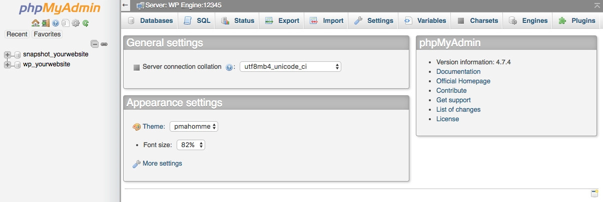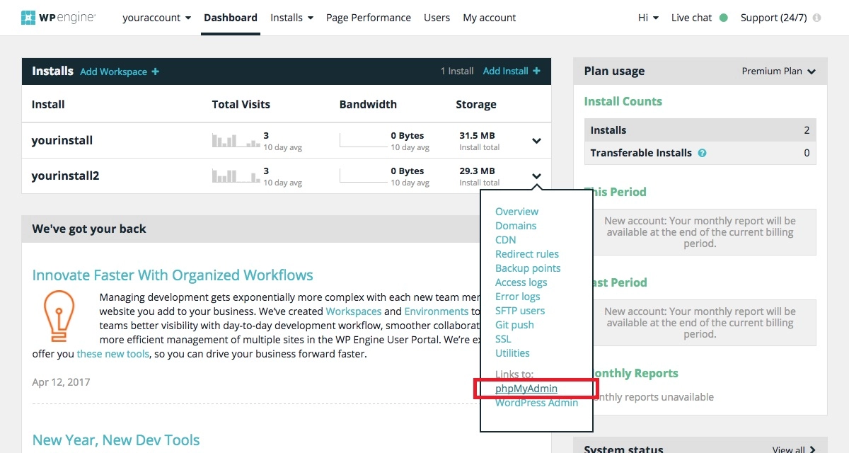 با این حال بسته به نوع هاست خود ممکن است این بخش در جای دیگری وجود داشته باشد. به عنوان مثال کاربران WP Engine میتوانند phpMyAdmin را از داشبورد اصلی با کلیک بر روی آیکون chevron پیدا کنند: