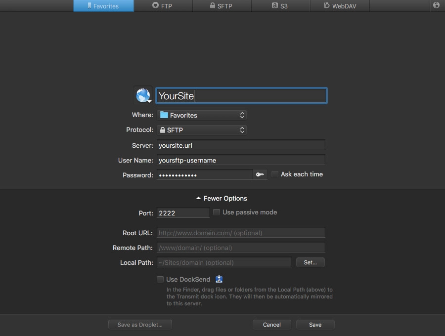 در مرحله بعد وارد نرم افزار انتخابی خود شوید (ما در اینجا از Transmit استفاده میکنیم) و جزئیات وبسایت خود از جمله آدرس وبسایت، نامکاربری و رمزعبور SFTP منحصربهفرد را وارد کنید و شماره پورت را به 2222 تغییر دهید.