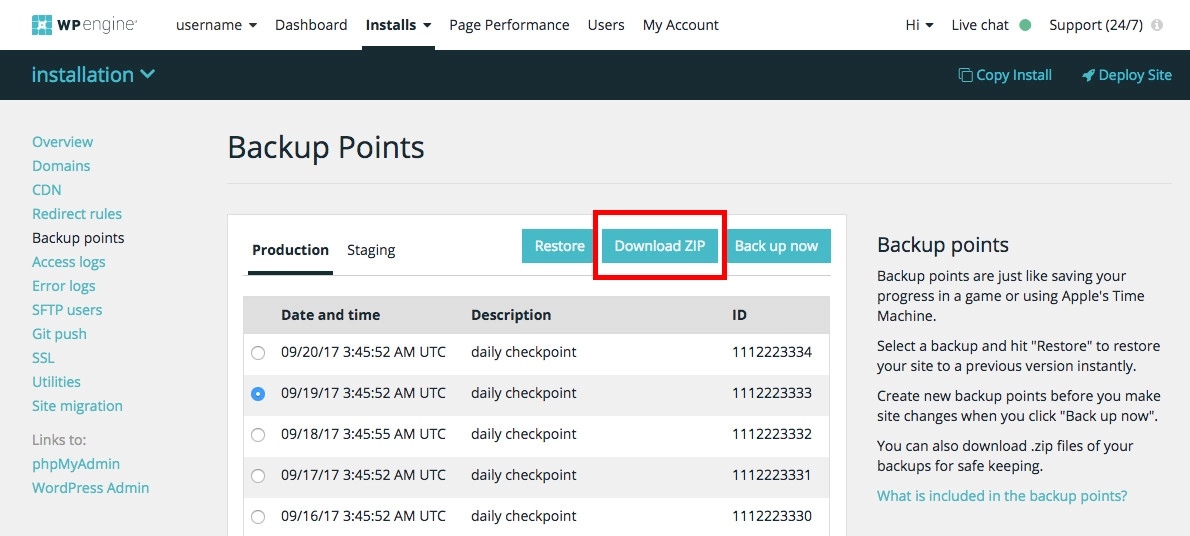 اولین گزینه این است که به سادگی هاستی را انتخاب کنید که بکاپگیری کامل و روزانه از سایت وردپرس شما را ارائه دهد. به عنوان مثال هاست مدیریتشده WP Engine به طور خودکار پشتیبانگیری روزانه از همه فایلهای اصلی وردپرس مانند قالبها، پلاگینها، پایگاه داده و حتی تمام فایلهای رسانهای را انجام میدهد. همچنین میتوانید در هر لحظهای (مثلا قبل از بروزرسانی اصلی وردپرس یا هنگام تغییر قالب) عملیات بکاپگیری خود را شروع کنید.