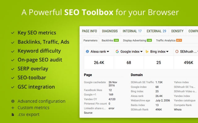 SEOQuake یک ابزار سئو رایگان است که توسط SEMrush منتشر شده و دادههای مهم تحقیق ارگانیک را ارائه میدهد. با استفاده از این افزونه کاربرها ابزارهایی مانند: SEO Audit، گزارش Keyword Density، تحلیل Internal/External Link و معیارهای اجتماعی را دریافت میکنند.