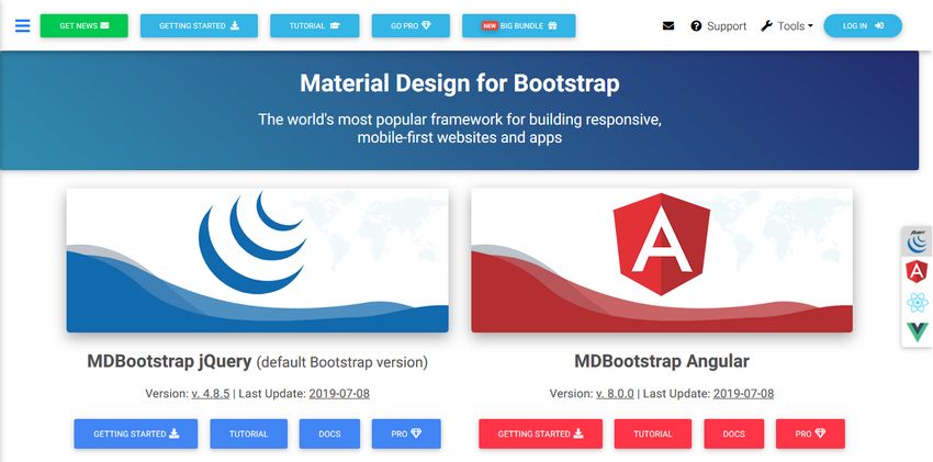 Material Design for Bootstrap یک کتابخانه منعطف رابط کاربری است که به شما اجازه میدهد تا وبسایتهای واکنشگرایی را براساس المانهای طراحی متریال ایجاد کنید. البته این ابزار در اصل برای کار با فریمورک بوتاسترپ ۴ ایجاد شده است. در پیکربندی پیشفرض این کتابخانه، برای تعاملی کردن صفحات از جیکوئری استفاده میشود با این حال گزینههایی برای استفاده از فریمورکهایی مانند انگولار، ریاکت و ویوجیاس نیز وجود دارد.