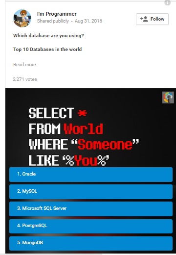 طبق نظرسنجی ای که ما از بین برنامه نویس های مختلف در گوگل پلاس داشتیم. درمورد تمام دیتابیس های SQL و NoSQL نظرسنجی کردیم و شما میتونید محبوب ترین دیتابیس های 2016 رو مشاهده کنید :