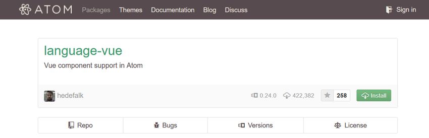 این پکیج میتواند پشتیبانی از کامپوننت Vue را به ویرایشگر کد محبوب Atom اضافه کند. میتوانید این پکیج را از بخش تنظیمات و سپس منوی Install موجود در ویرایشگر نصب کنید. این ابزار میتواند ویرایشگر شما را با هایلایت کردن سینتکس و اسنیپتهای کد Vue.js بهبود ببخشد.