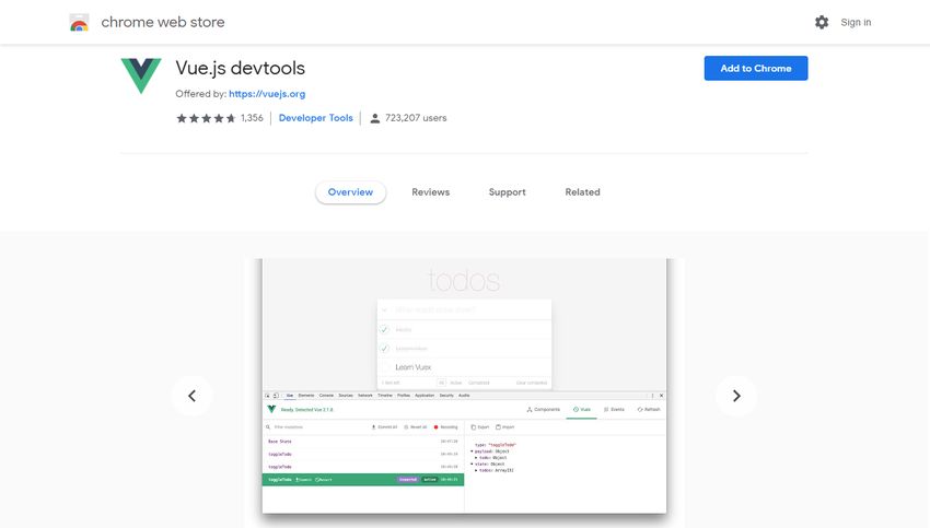این ابزار یک بخش Vue را به DevTools شما در کروم اضافه میکند. همچنین یک افزونهی ساده برای کروم است که تنها با یک کلیک میتوانید آن را به راحتی نصب کنید. اساس این ابزار مانند ابزار گفته شده برای فایرفاکس است. میتوانید از این افزونه برای بررسی کامپوننتهای Vue.js، وضعیتها و غیره در مرورگر استفاده کنید.