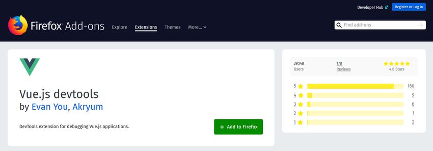 شما میتوانید این افزونه را به DevTools خود در فایرفاکس اضافه کنید. این افزونه یک بخش Vue را به جعبه ابزار شما اضافه میکند تا بتوانید اپلیکیشنهای Vue.js خود را آنالیز و اشکالزدایی کنید. با کمک آن میتوانید کامپوننتها، وضعیت و موارد دیگر را بررسی کنید. همچنین با استفاده از این افزونه میتوانید کد منبع پروژهی خود را در GitHub مشاهده کنید.