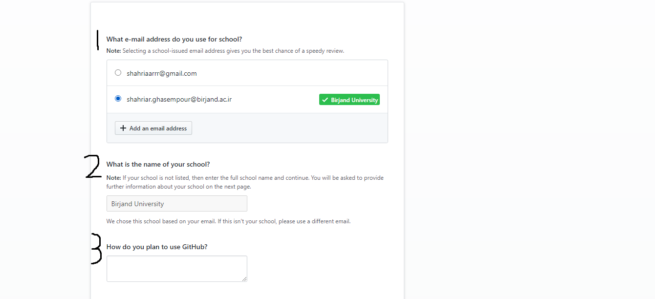 خوشبختانه دانشگاه های ایران تحریم نیستند و گیت هاب بیشتر دانشگاه های ایران رو میشناسه و شما به محض وارد کردن ایمیل دانشگاهیتون میفهمه کدوم دانشگاه هستین خودش اسم دانشگاهتون رو مینویسه و این بخش رو قفل میکنه