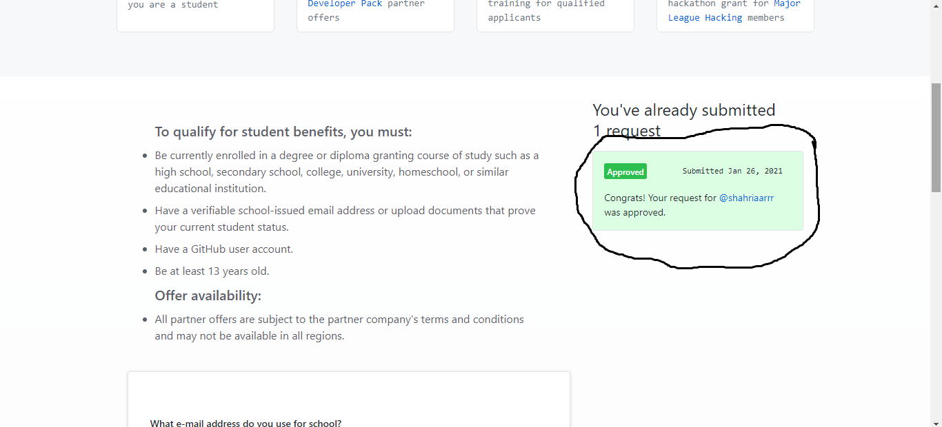 شما اون صفحه رو حتما دوباره چک کنین.هر وقت همچین پیامی در سمت راست صفحه دیدین به معنای این است که پک دانشجویی گیت هاب به شما تعلق گرفته و میتونین از 100 درصد امکانات گیت هاب بدون پرداخت یک سنت تا زمانی که دانشجو هستین استفاده کنین و لذت ببرین