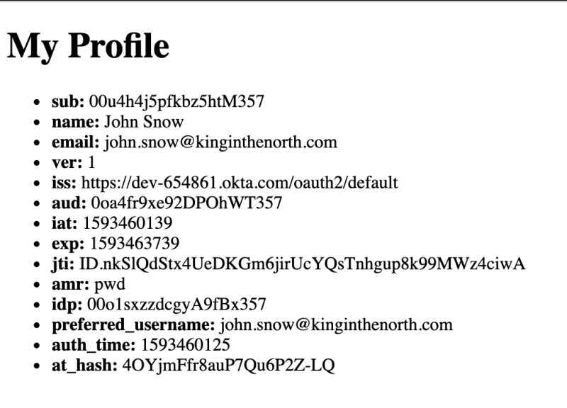 پس از اجرا، قادر خواهید بود روی لینک view در صفحه اصلی کلیک کرده و به صفحه ورود میزبان Okta هدایت شوید. پس از ورود به سیستم، به صفحه view هدایت خواهید شد و مشخصات و شناسه خود را در یک لیست مشاهده خواهید کرد.