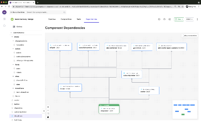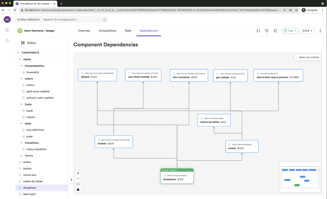 یک کامپوننت مستقل "drop-down" به صورت جداگانه رندر شده است. همچنین نمودار وابستگی کامپوننت توسط Bit ایجاد شده که از آن برای جداسازی کامپوننتها و انتشار CI از یک کامپوننت به تمام وابستگیها استفاده میشود.