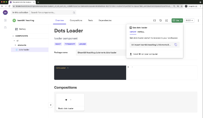 بیایید کامپوننت dots-loader را از محدوده متعلق به teambit ایمپورت کنیم. برای انجام این کار به صفحه کامپوننت dots-loader میرویم و دستور import را کپی کرده و اجرا میکنیم.
