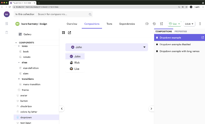 یک کامپوننت مستقل "drop-down" به صورت جداگانه رندر شده است. همچنین نمودار وابستگی کامپوننت توسط Bit ایجاد شده که از آن برای جداسازی کامپوننتها و انتشار CI از یک کامپوننت به تمام وابستگیها استفاده میشود.