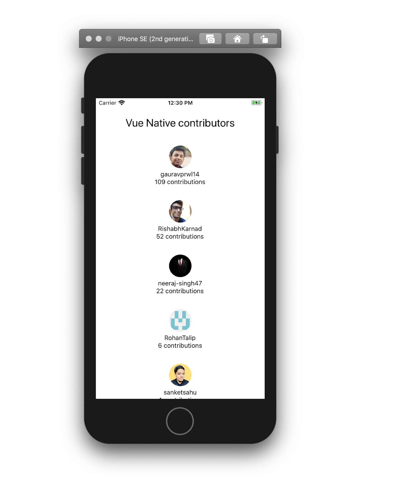 بیایید یک برنامه ساده ایجاد کنیم که لیستی از مشارکت کنندگان vue native را با صفحه ورود، تصویر و تعداد آنها نشان میدهد. ما میخواهیم لیست را از GitHub REST API واکشی کنیم.