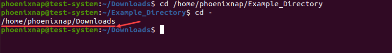 برای اینکه وارد دایرکتوری قبلی (دایرکتوری که پیش از دایرکتوری کنونی در آن حضور داشتهاید) شوید میتوانید یک علامت (-) را بعد از دستور cd وارد کنید. برای مثال تصور کنید که شما قبلا در دایرکتوری Downloads حضور داشتهاید و حال وارد دایرکتوری Example_Directory شدهاید، با وارد کردن دستور زیر شما دوباره به Downloads برخواهید گشت: