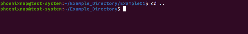 برای اینکه به دایرکتوری ریشه (به نسبت مسیر کنونی) وارد شوید میتوانید علامت (..) را وارد کنید. برای مثال تصور کنید در دایرکتوری Example01 قرار دارید و دایرکتوری ریشه Example_Directory است. برای ورود به این دایرکتوری دستور زیر را وارد کنید: