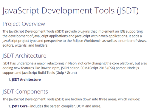یکی از شناخته شده ترین IDE های برنامهنویسی Eclipse است. احتمالا با آن از طریق زبان های برنامه نویسی مختلف، برنامه نوشتهاید. Eclipse با استفاده از کامپوننت JSDT (ابزار توسعه جاوا اسکریپت) توانایی این را به توسعه دهندگان می دهد که بتوانند با آن کدهای جاوا اسکریپت بنویسند. JSDT برای پایه JDT نوشته شده و با آن می توانید اپلیکیشن های وب و عمومی جاوا اسکریپت را بنویسید.